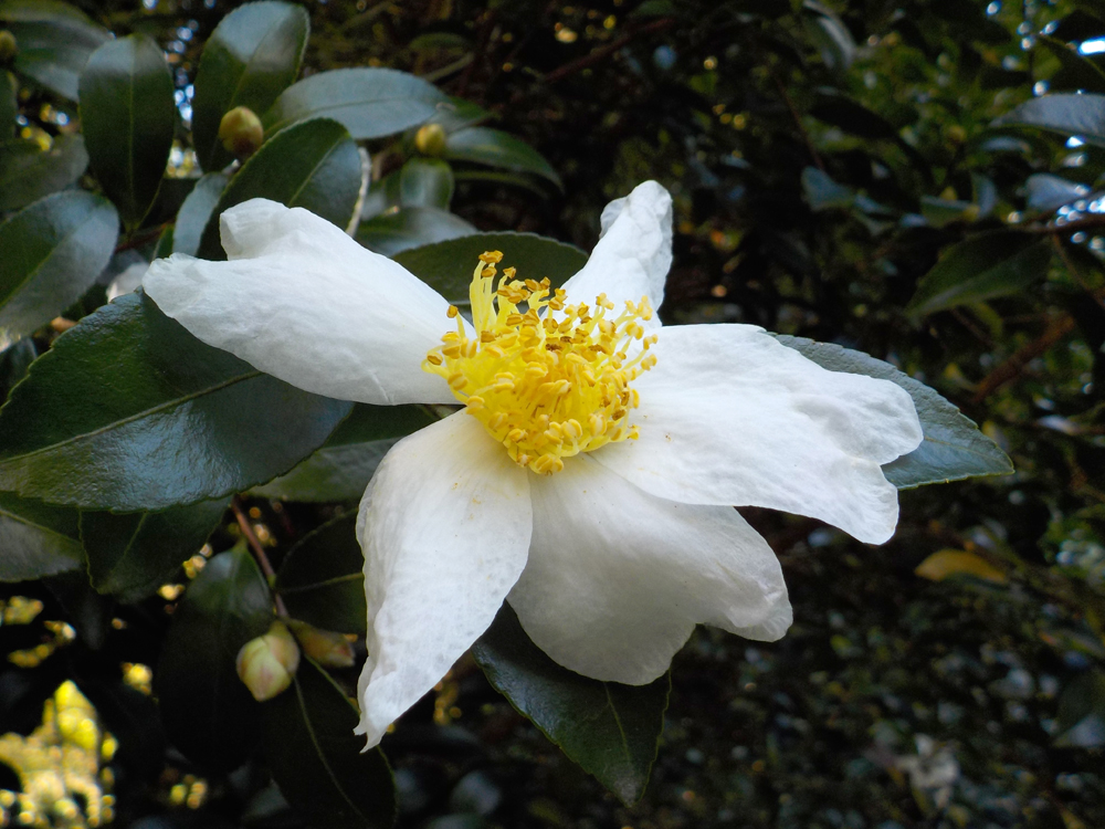 晩秋から初冬に開花するツバキ属の一種。多くの園芸品種がありますが、野生のサザンカは写真のように白色で一重咲きです。