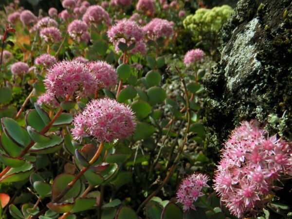 エッチュウミセバヤは、世界で富山県にしか自生していない植物です。ベンケイソウ科の多年草で、1973年に新種として発表されました。その姿は、長さ15cmから30cmの茎に、丸い多肉質の葉が3枚ずつ輪を描くように並んでいます。茎の先には、星形でピンク色の花が数十個集まって付きます。エッチュウは富山県の古い呼び名で、富山県産であることを示し、ミセバヤという名前は昔の言葉で「見せたい」を語源としています。現在、エッチュウミセバヤの花は、美しく咲き誇り、見頃となっています。園内では入園口からサンライトホールへのエントランスの柱、鉢物展示場、高山・絶滅危惧植物室、日本の植物ゾーンのロッケリーに展示しています。