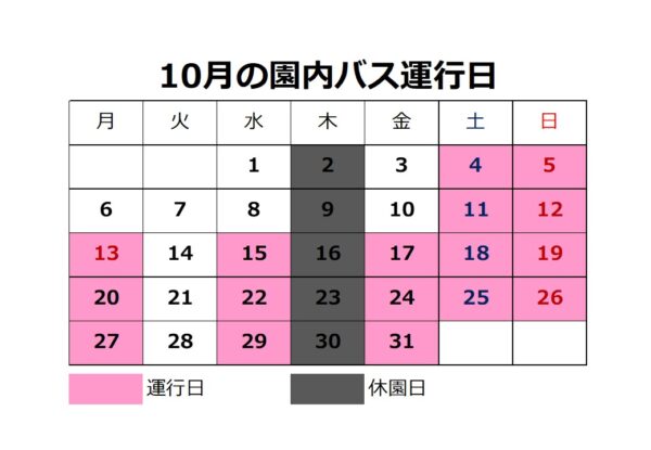 2025.10.01 10月の園内バス運行日のお知らせ 令和7年(2025)10月の園内バス運行は下記のカレンダーで行います。 ※都合により、運行日が当初の予定から変更になっています。ご迷惑をおかけしますが、ご理解のほどよろしくお願いします。