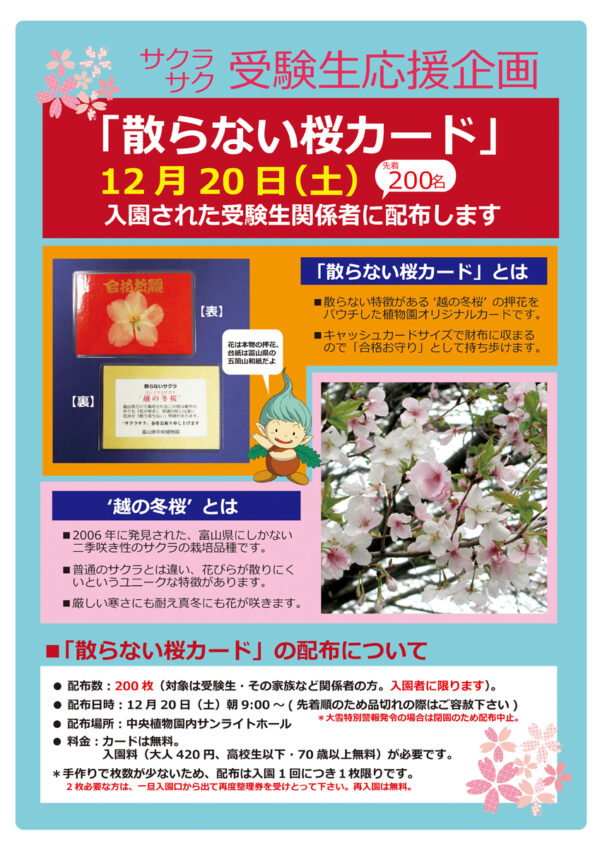 サクラサク受験生応援企画として、中央植物園では「散らない桜カード」を配布してまいりました。